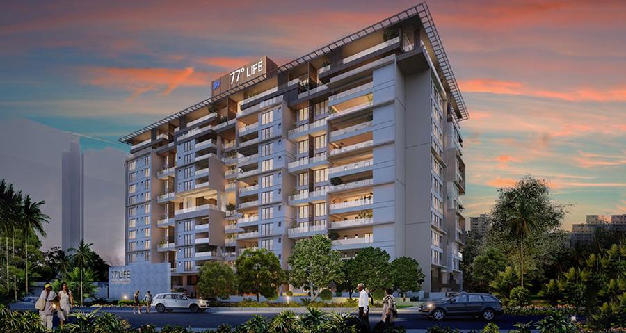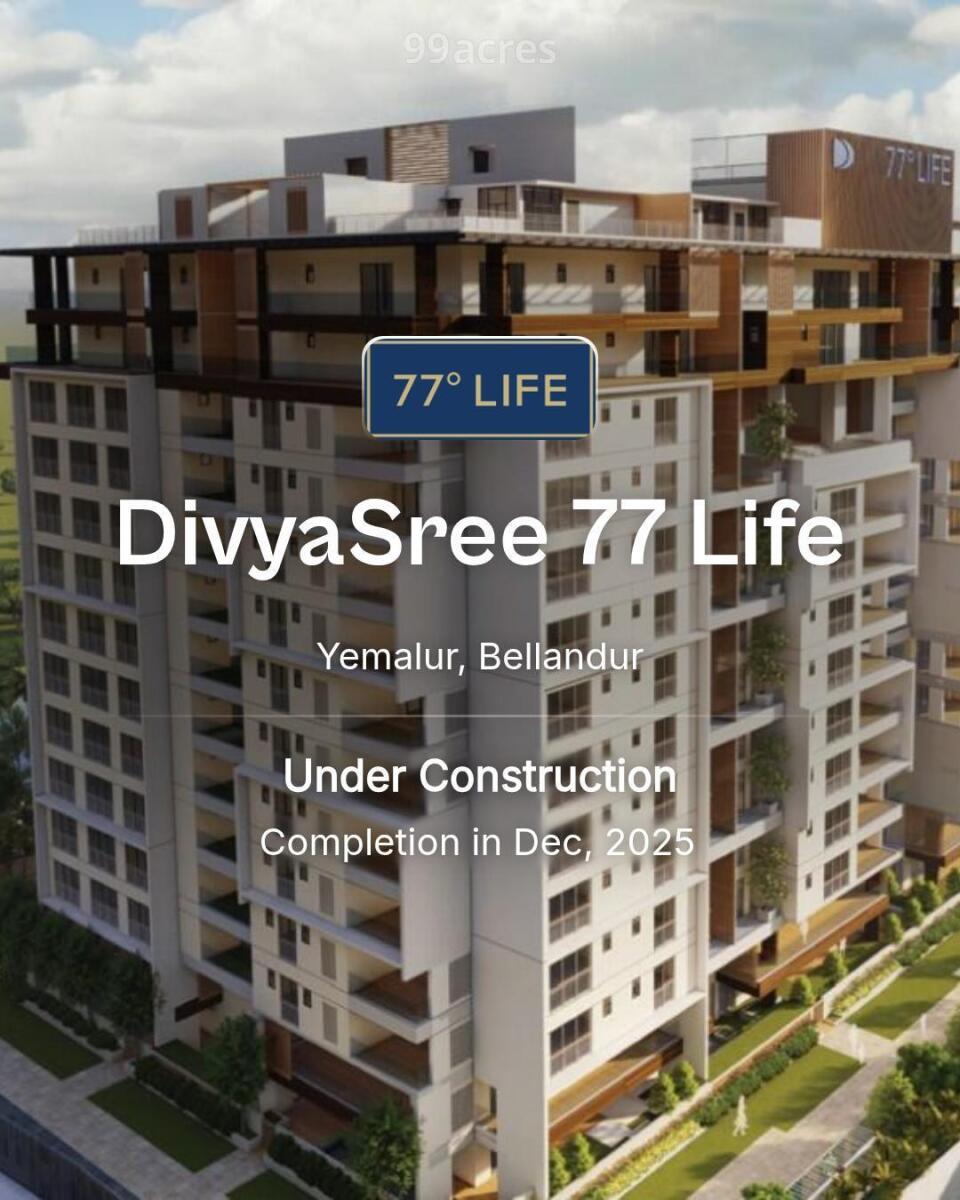 DivyaSree 77 Life is an iconic ultra-luxury residential development situated within the expansive 77 Town Centre in Yemalur. Developed by DivyaSree Infrastructure Projects, this single-tower high-rise features 133 meticulously designed units across 14 floors. The project is marketed as the 'final chapter' of a residential trilogy, offering a blend of sophisticated architecture and expansive green spaces.